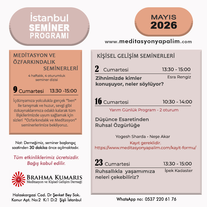 Meditasyon ve kişisel gelişim üzerine seminer, atölye çalışmaları ve çeşitli etkinlikleri içeren aylık programlar